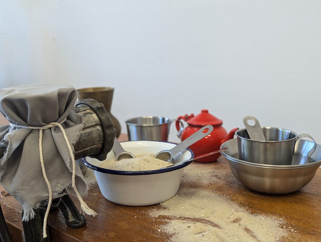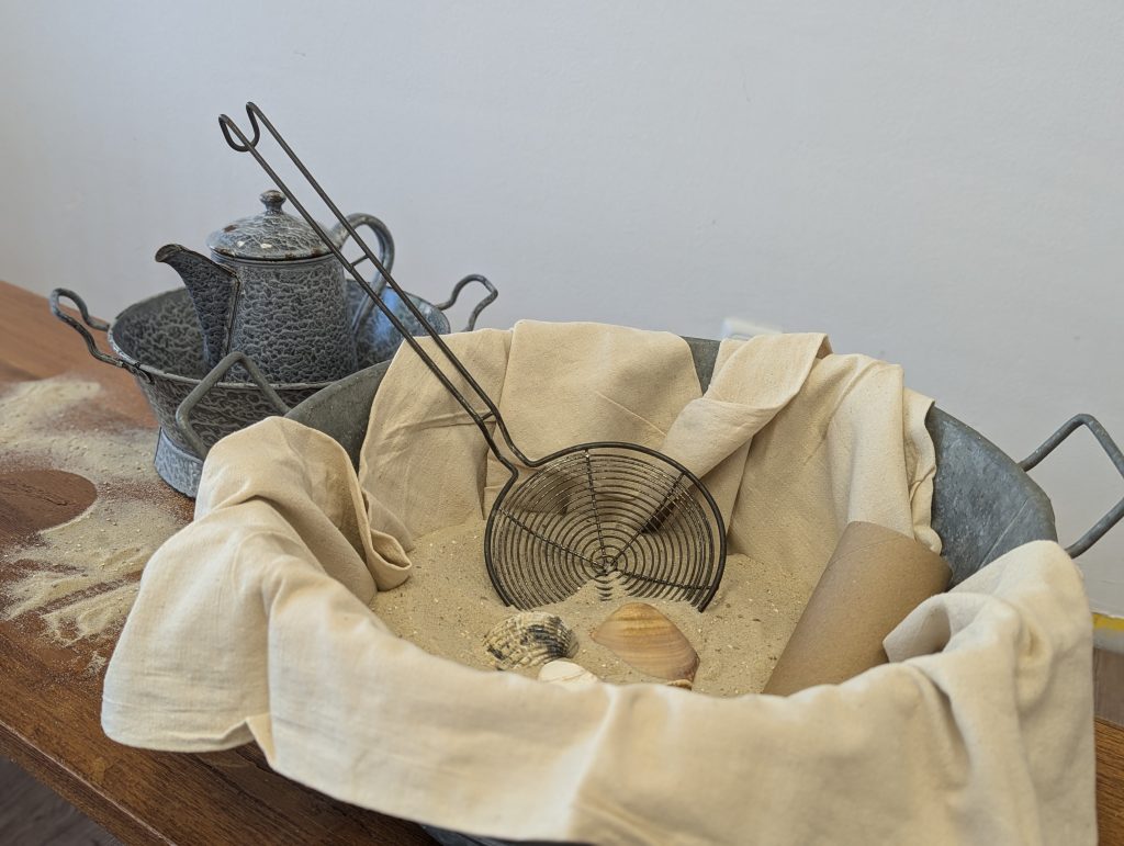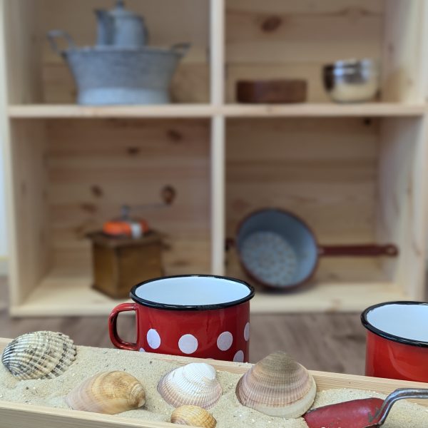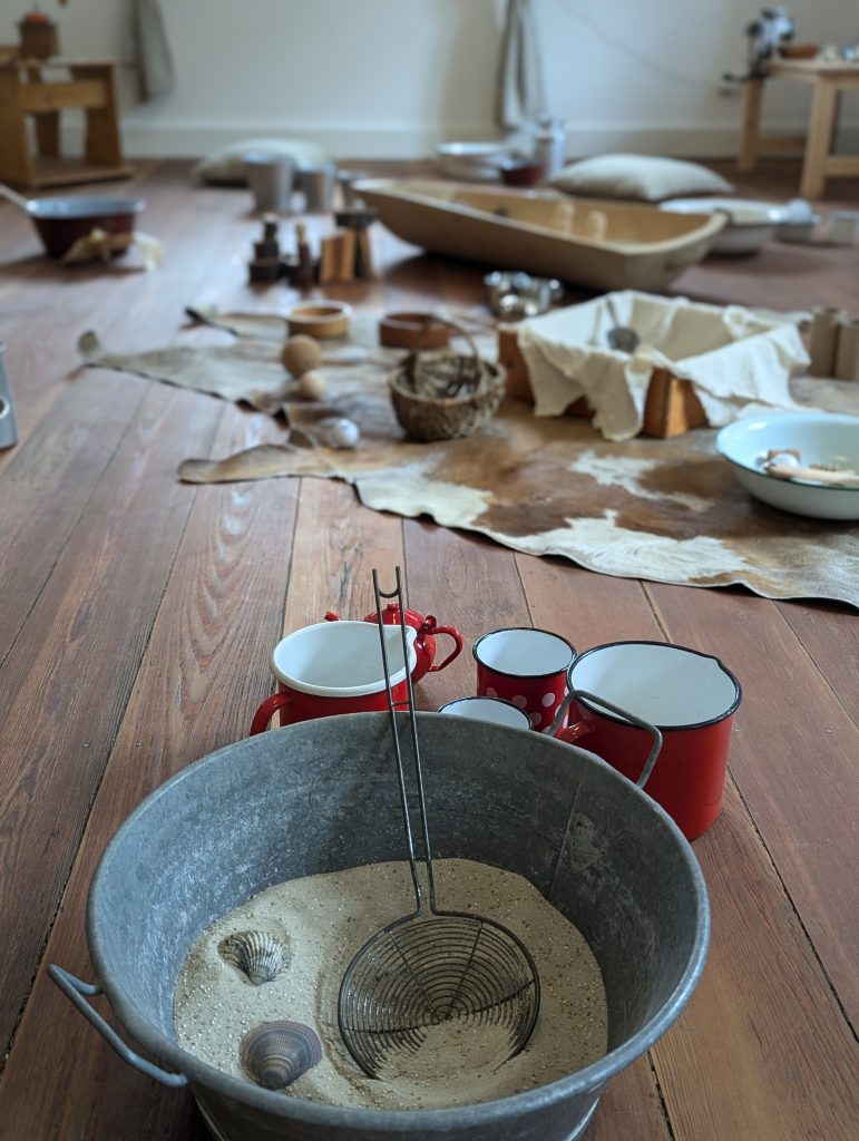 Der ungewöhnliche Spielraum ist mit formschönen, teils antiken Küchenutensilien aus Emaille, Holz und Metall ausgestattet. Auf niedrigen Tischen und dem Boden befindet sich reichlich feinster, weißer Sand in großen Schüsseln und Körben. In den Wandregalen sind zahlreiche Kästchen, Dosen und Schubladen zu finden, die mit verschiedenen Kleinmaterialien gefüllt sind. Eine Vielzahl von Bürsten, Pinseln und Besen vervollständigen die Einrichtung. Die liebevoll gestaltete Umgebung mit ihrer Vielfalt an ästhetischen Materialien lädt Kinder sofort zum Spielen ein und ermöglicht den Erwachsenen, zur Ruhe zu kommen.